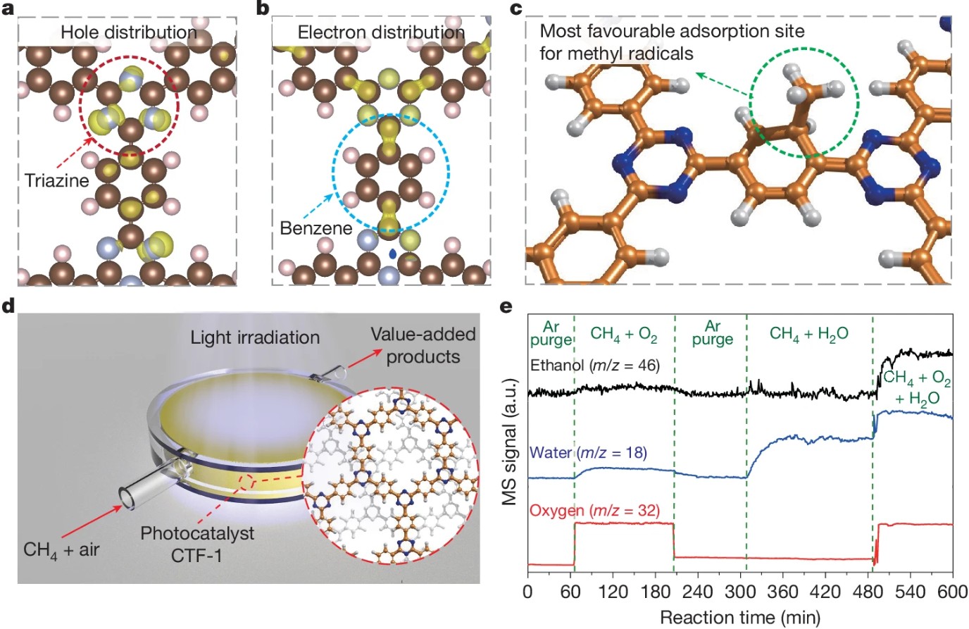 Professor Tang Junwang's team proposed a novel concept of molecular junction and developed the CTF-1 catalyst. Leveraging the synergy between triazine and benzene ring units, this catalyst enables the highly efficient, one-step conversion of methane to ethanol at room temperature and pressure under light irradiation. This technology provides a groundbreaking pathway for the high-value utilization of natural gas resources, which not only helps reduce the chemical industry's heavy reliance on petroleum but also contributes to achieving carbon neutrality goals.