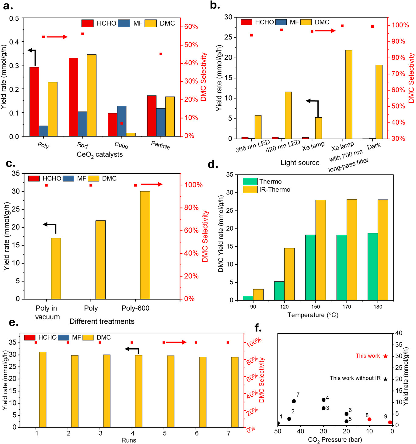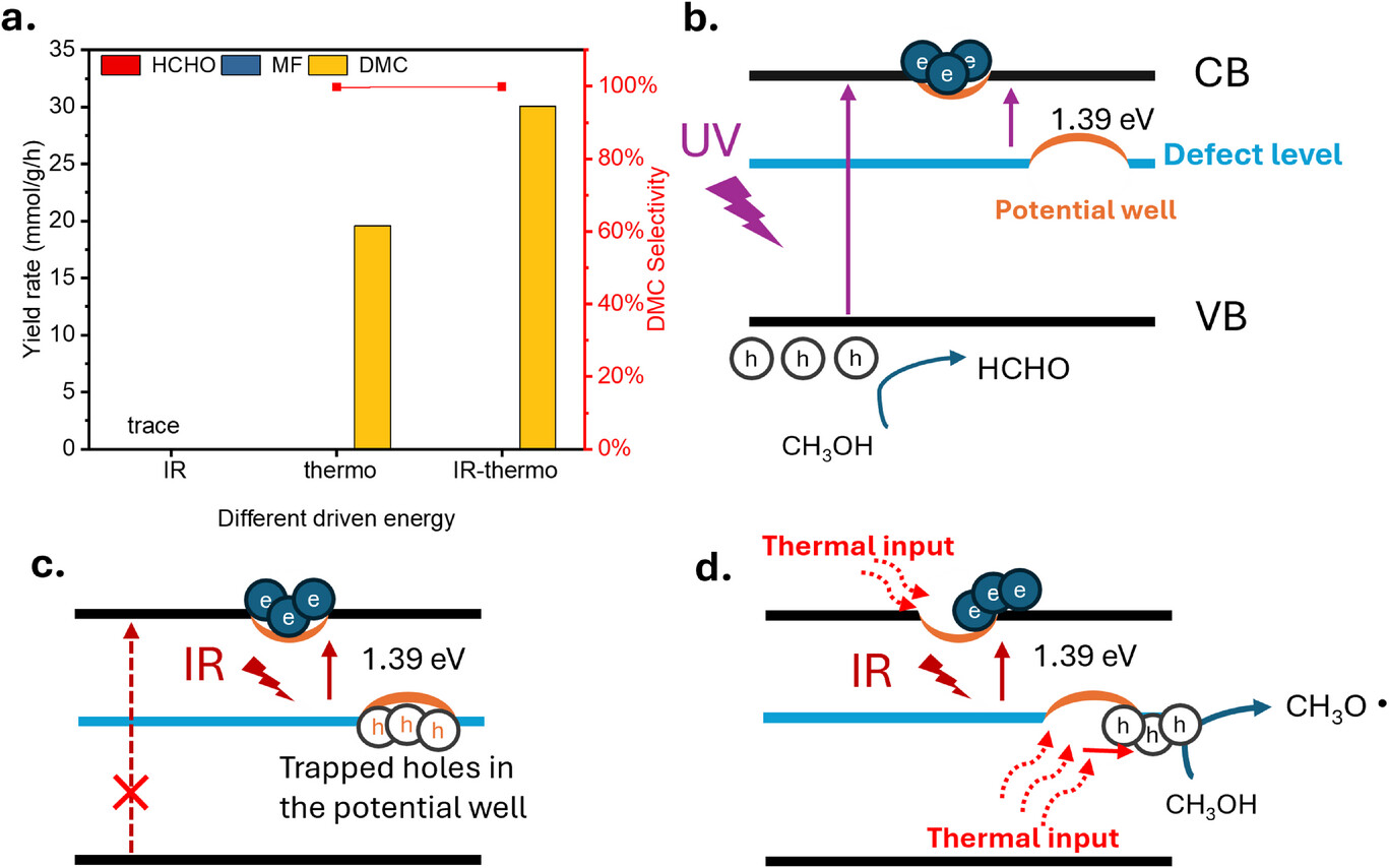 Our group has achieved a breakthrough in converting CO2 into dimethyl carbonate (DMC). By utilizing a novel photon-thermal synergy process with a defect-engineered, noble-metal-free cerium oxide catalyst, first author Chen, Enqi and colleagues have attained a remarkable DMC production rate of 30 mmol/g/h with 100% selectivity. This work overcomes the performance bottlenecks of conventional thermal catalysis and introduces a new strategy of IR-driven catalysis for CO2 utilization.