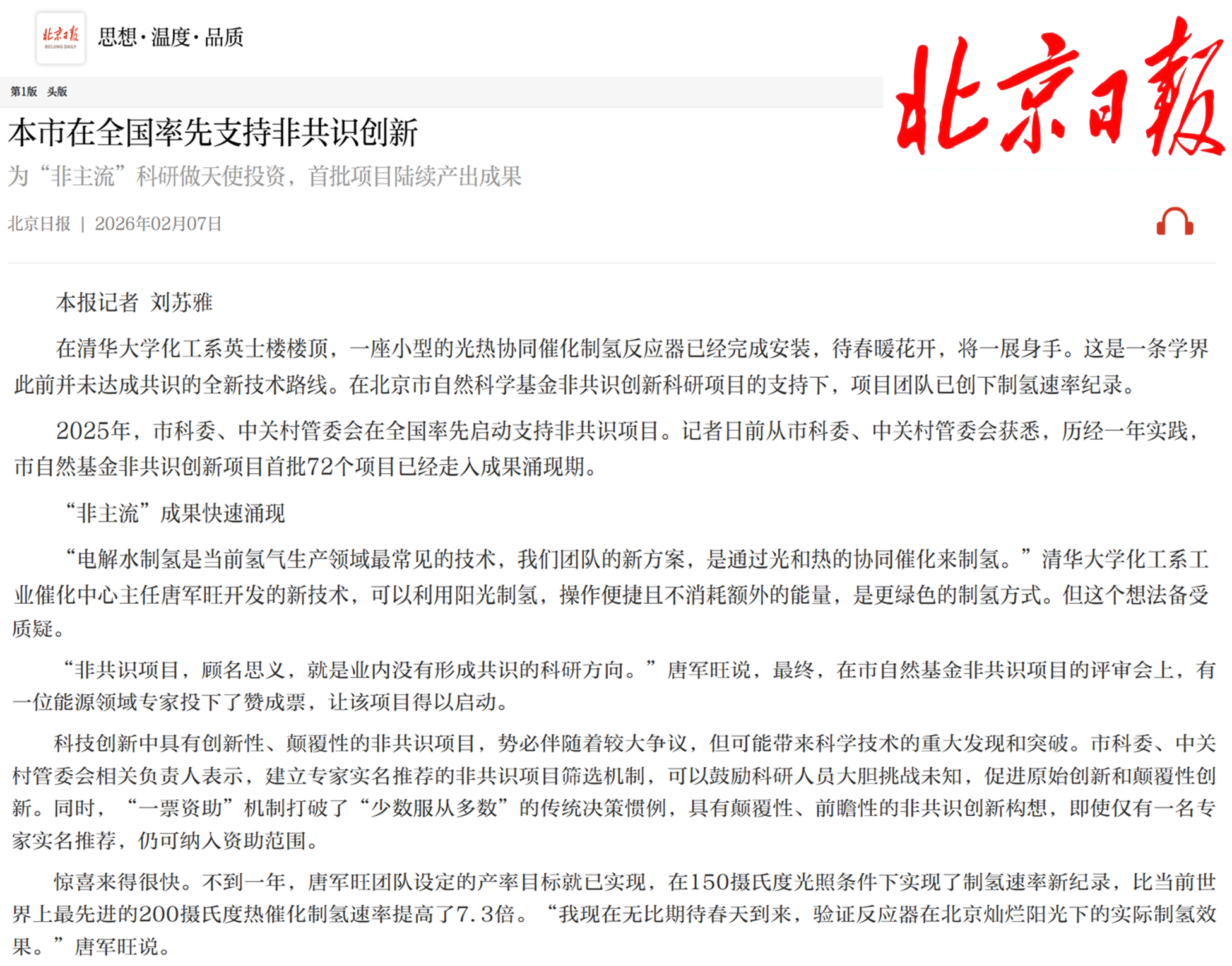 We are pleased to share that our team’s work on innovative solar hydrogen production has been recently featured in two leading national publications: Beijing Daily and Science and Technology Daily.