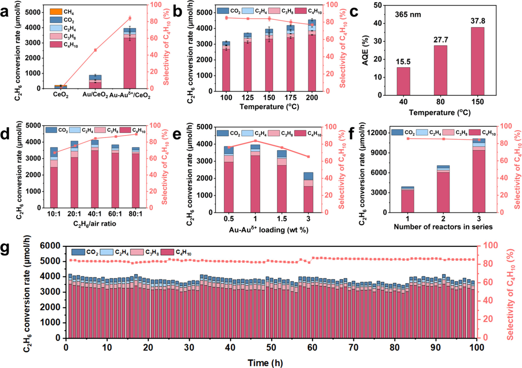 Harnessing the synergy of light irradiation (photons) and heating (mainly phonons) , the system delivers a butane production rate of 166.5 mmol/g/h with 85% selectivity at a high space velocity, along with a turnover number of 410,000 and excellent stability over 100 hours. The process scales readily while maintaining performance and achieves an apparent quantum efficiency of 38%. This work provides a powerful example of how multifield coupling—photons, phonons, and charge relays—can be orchestrated to enable low‑carbon, sustainable synthesis of valuable chemicals.