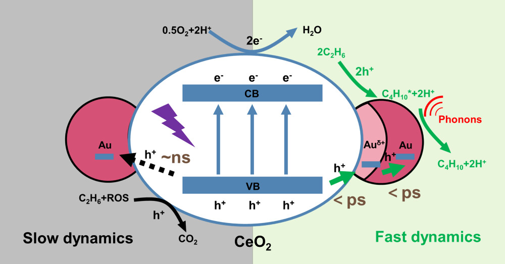 A new study from the Tang group, demonstrates an elegant strategy to achieve highly selective C–H activation of ethane under mild conditions. By designing a Au–Auδ⁺/CeO₂ catalyst, first author Qin, Ziying and colleagues established a Auδ⁺–Au relay that accelerates hole transfer from the support to the active sites by 1000‑fold—from nanoseconds down to picoseconds. This ultrafast charge separation suppresses unwanted C–C cleavage and overoxidation, directing holes precisely toward the desired C–H activation.
